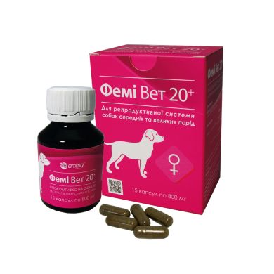 Phytocomplex Femi Vet 20+ for dogs of medium and large breeds is used for prophylaxis and in combination with drugs for the treatment of diseases of the reproductive system. Qualitative and quantitative composition: Each gelatin capsule contains extracts: Aloe vera leaves – 120.0 mg; Asparagus root (Asparagus racemosus) – 120.0 mg; Indian Saraca bark (Saraca indica) – 120.0 mg; Vitania root (Withania somnifera) – 100.0 mg; bark of Ficus bengal (Ficus benghalensis) – 50.0 mg; Shilajit (Asphaltum punjabianum) – 50.0 mg; Indian Hemidesmus root (Hemidesmus indicus) – 40.0 mg; fruit Tribulus creeping (Tribulis terrestris) – 30.0 mg; leaves of Indian Azadirachta (Azadirachta indica) – 30.0 mg; Ginger root (Zingiber officinale) – 30.0 mg; root of Turmeric long (Curcuma longa) – 30.0 mg; Licorice root (Glycyrrhiza glabra) – 30.0 mg; Bitter myrrh gum (Commiphora mukul) – 20.0 mg; Phyllanthus emblica fruit – 10.0 mg; fruit Terminalia chebula (Terminalia chebula) – 10.0 mg; fruit Terminalia belerica – 10.0 mg. Excipients: fructose – qs. Does not contain genetically modified organisms and chemical preservatives. Extracts of medicinal plants, which are part of: scientifically researched for safety and effectiveness; DOES NOT contain chemicals or preservatives; DO NOT contain toxic elements and GMOs. Pharmacological action The biologically active substances contained in the extracts of the phytocomplex Femi Vet 20+ contribute to the normalization of the reproductive system. They have anti-inflammatory and bactericidal properties, normalize hormonal levels, and improve lactation in bitches that feed puppies. Indications for use The preparation Femi Vet 20 + is used in bitches of medium and large breeds for prophylaxis and in combination with drugs for the treatment of diseases of the reproductive system, changes in hormonal levels, pathological disorders as a result of childbirth, agalactia. Dosage: Give to animals 30 minutes before feeding on the root of the tongue or mix the contents of the capsule with wet food in the following doses: dogs from 20 kg to 50 kg – 1 capsule once every 48 hours; dogs 50 kg or more – 1 capsule 1 time in 24 hours. The minimum duration of use is 15 days. The recommended course of application is from 1 to 2 months. Precautions Individual intolerance to the components. There were no side effects and complications after application. In some cases, a mild laxative effect is noted. Type of animals: dogs of medium and large breeds weighing from 20 kg. Release form: gelatin capsules weighing 800 mg ± 7%, fifteen capsules (No. 15) in a polymer bottle. Manufacturer, customer and brand owner: Amma Life Science LLC, st. Alma Atinskaya, 2/1, m. Kiev, Ukraine, 02090 Country of origin of raw materials: India (India).