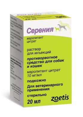 The active substance of Serenia – maropitant citrate – is an antagonist of neurokinin receptors (NK1) and inhibits the binding of substance P, a neutropeptide of the tachykinin group, in the central nervous system. Maropitanta citrate is effective in vomiting of both central and peripheral genesis. Maropitant is rapidly absorbed from the injection site and reaches its maximum plasma concentration 45 minutes after administration. More than 99% of maropitant binds to blood plasma proteins. The bioavailability of Serenia is 90%. Maropitant is metabolized in the liver by cytochrome P450, excreted mainly in feces.